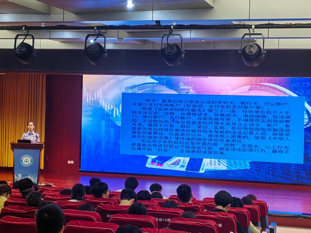 讲座现场,张主任结合自身多年丰富的办案经验和近年来高校诈骗案件数据,以“识破诈骗套路,远离财产陷阱”为主题,通过PPT展示、案例视频播放等形式,系统讲解了当前针对大学生的常见诈骗类型。张主任从“冒充客服退款”“虚假刷单兼职”“校园贷连环套”,到“游戏账号交易诈骗”“冒充熟人借钱”,并结合近期发生在周边高校的真实案例,详细拆解了每种诈骗手段的“话术陷阱”与“操作流程”。“大家一定要记住,凡是要求你‘先转账、后办事’的,凡是声称‘低投入、高回报’的,全是诈骗!”,张主任告诫同学们一旦发觉被骗或遇有可疑情况,要保持冷静,第一时间保存证据并立即向辅导员和学校安全管理部门报告。