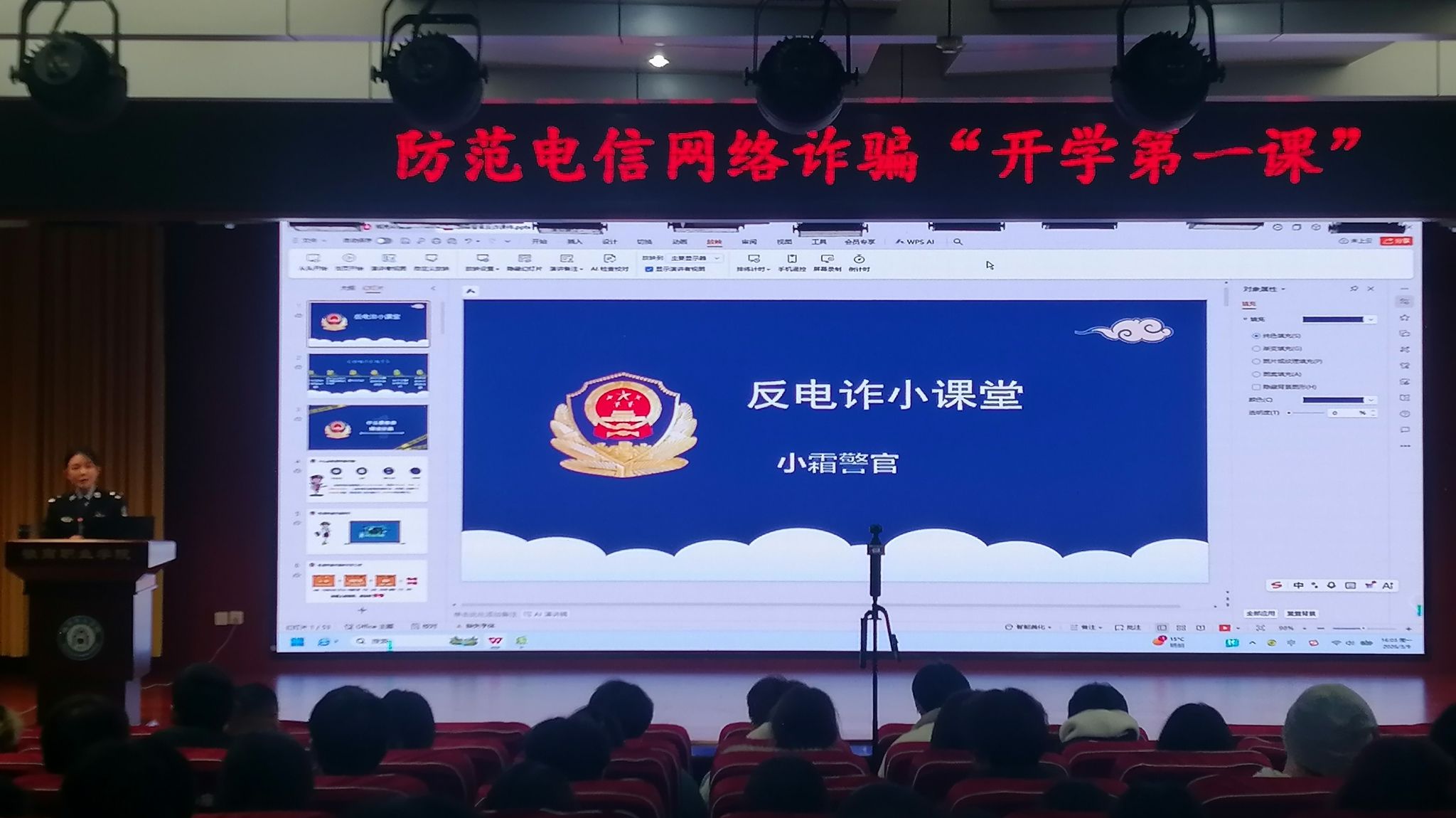 主讲警官为师生们系统讲解了“什么是电信诈骗”“为什么电信诈骗破案难”“什么是断卡行动”“电信诈骗受害群体特征”等内容,同时结合2025年1月至2026年2月属地发生的大学生电诈受骗案件,梳理了12种电信网络诈骗常见类型,详细讲解了各类诈骗的手法、话术、套路与心理操控手段,特别警示了屏幕共享的新陷阱,提醒师生在任何情况下都要警惕屏幕共享请求,这极易导致密码、验证码等关键信息泄露。